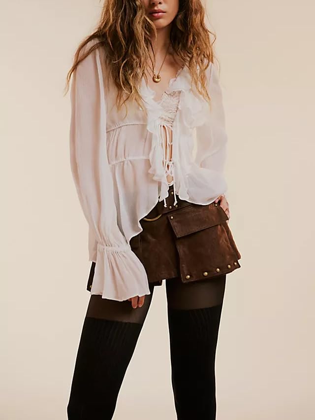 Specification: Lace Long Sleeve Tops for Women Boho Tie Front Ruffle Trim Coquette Shirts Y2k Button Flowy Peplum Blouse Going Out